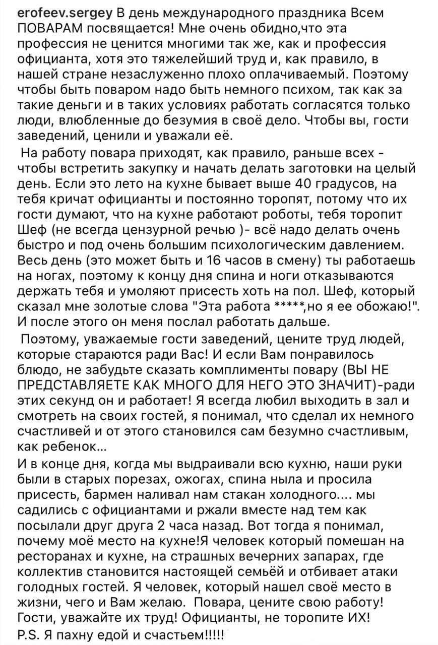 Пусть день будет ясным, а настроение прекрасным. (Послание от Шефа) Есть такой праздник - день повара, он отмечается 20 октября. Один повар в небольшом тексте очень точно расписал нашу работу. Я очень хочу, чтобы и вы его прочитали в конце моей истории. Прошли те времена, когда я мог запустить сковородку в стену на кухне во время работы. Сейчас я настоящий шеф-повар.